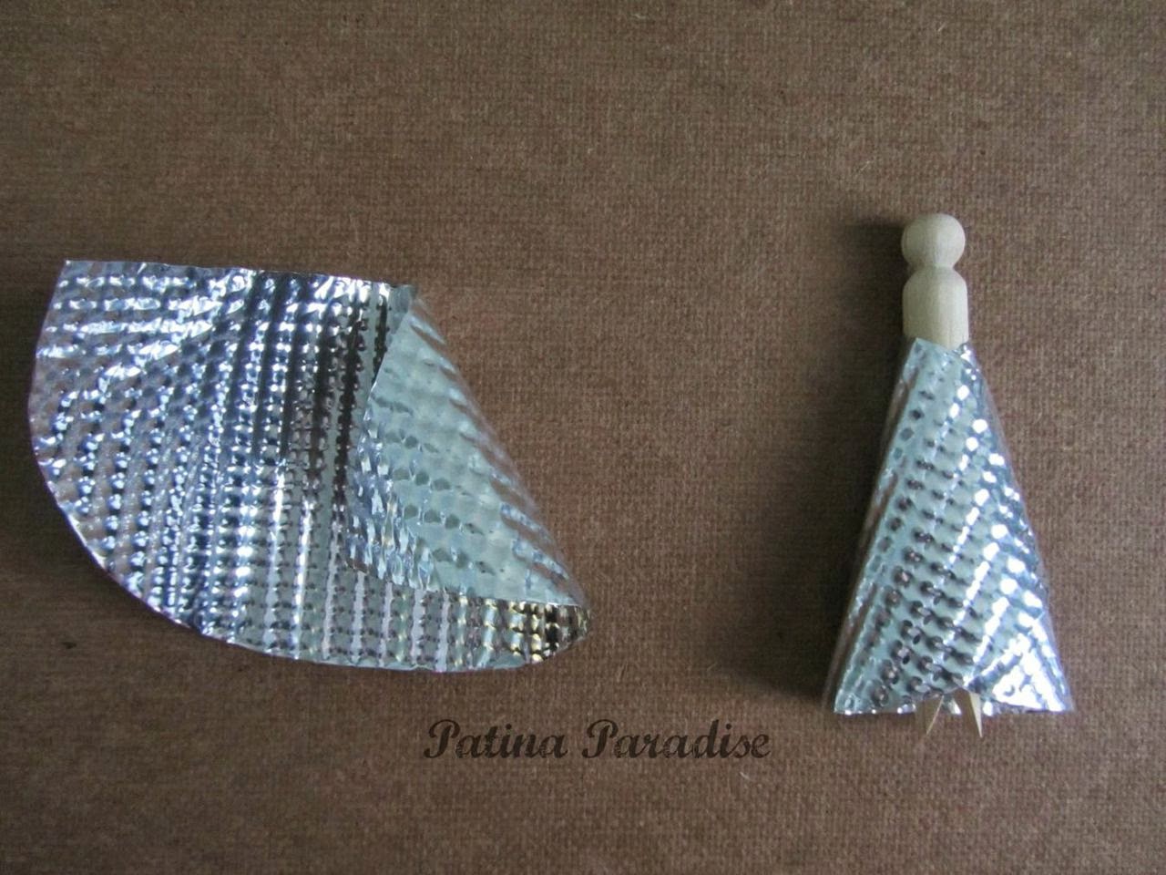 Then you will need to roll your semicircle into a cone shape and put it over the clothes peg. Glue it into place with a dab of hot glue on the backside so that the glue doesn't show when the ornament is hanging on the tree.