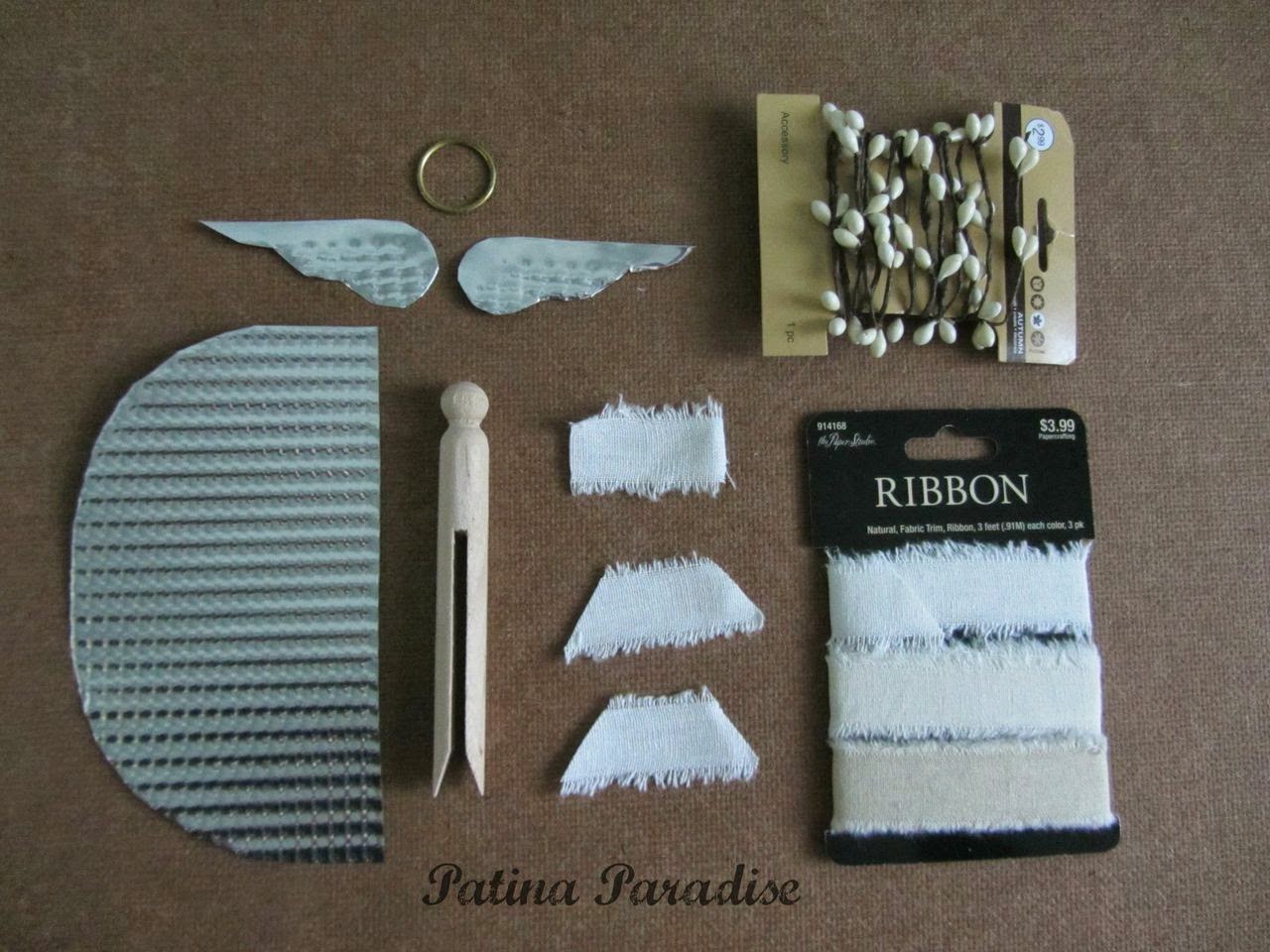 The floral wire and the ribbon were purchased from my local craft store. I already had the little circular halos...and I am afraid I don't remember where I picked them up. Probably at a garage sale? The clothes pegs can be found at Walmart or most craft stores.