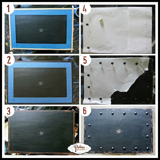 1. Use narrow tape to measure out an equal edging on the drawer and then add painters tape to the inside. 2. Remove tape on the edge and you are ready to add some paint. 3. Use rust coloured paint and a touch of silver paint on outer edge of the drawer and the outer edge of tape. 4. The nailheads were originally gold coloured and I painted them black with tiny bits of rust and silver paint as well. In order to save time, I used my Silhouette designer program to create a printout of evenly spaced dots to indicate where the nailheads would go. Placing it on the drawer front I hit the nailheads halfway in one at a time. 5. Once they are all halfway hammered in, tear off the paper and hammer them all the way down. 6. I lightly sanded the facade to give it more of a worn look.