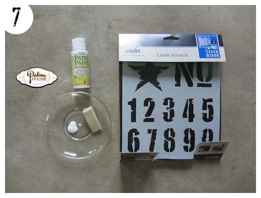 7. This number stencil that I bought at Walmart did the trick to add just a bit more of an industrial vibe. To paint the numbers I used some outdoor acrylic paint, (but you can use regular acrylic), and a makeup sponge wedge to apply it to the stencil.