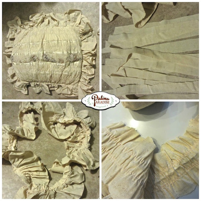 I cut the ruffle edging off the pillow in one piece and then cut the ruffle piece in half. Other ideas for getting the ruffled edging… you could sew the ruffle yourself if you have a sewing machine and know how to or find vintage curtains with ruffled bottoms. You could even use a ruffled ribbon.