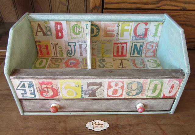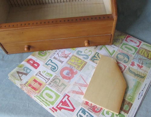 So to cover up the grooves with something, I looked through my stash of scrapbook paper and found a package I had bought at Tuesday Morning a while back for just a couple of bucks. I thought the letters and numbers lent themselves well for a desktop organizer.
