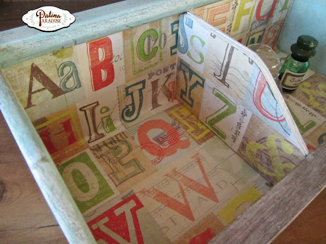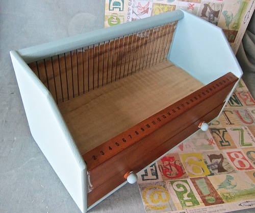 The scrapbook paper happened to be just the right width for the project and was thicker than your normal paper so it disguised the grooves really well. I used Mod Podge to adhere it to the inside and to the divider. I ended up with a bit of excess paper after bending it up and adhering it to the inside front and cut it off with an exacto knife. I also cut a strip of it to adhere to the front above the drawer.