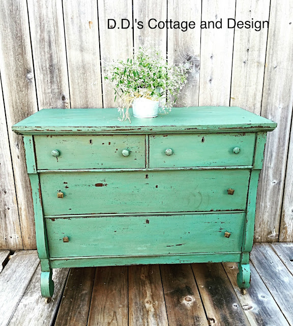 This beautiful empire dresser was given the Mustard Seed treatment in Kitchen Scale, with a touch of Annie Sloan Dark Wax for the perfect shade of chippy, country turquoise. Excellent job, as usual, by DD's Cottage and Design!