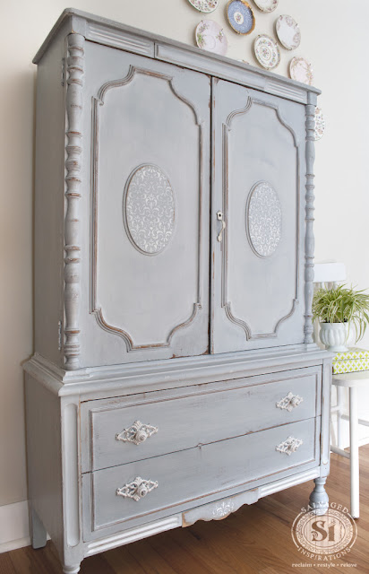 This antique armoire by Denise of Salvaged Inspirations was transformed into a blue/gray beauty. I say blue/gray because I see it as more blue than gray. What do you think? (you can weigh in on the debate on Denise's website) Either way, she gave this armoire a new life with this beautiful color.