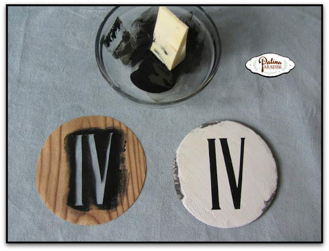 I used my Silhouette machine to cut out the stencils for each of the numbers out of inexpensive shelf lining paper from the Dollar Tree. And a makeup wedge sponge to apply the black paint onto them. The results were so crisp and clean. You can see the steps I used to make the faux enamel clock parts