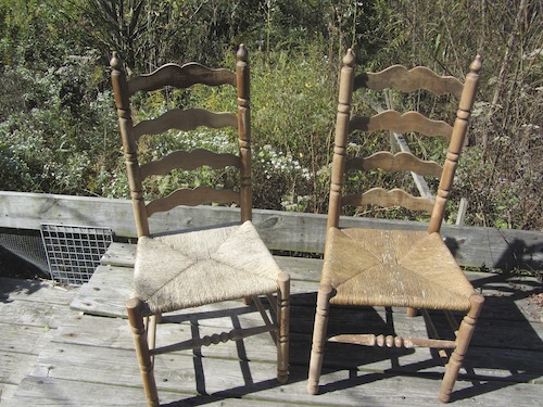They were in rough shape and I don't think any amount of oil would have given the wood or caning enough protection. I began by wiping them down with hydrogen peroxide and water to kill any mold that might have been on them and then with vinegar and water and a damp cloth. I sanded off the varnish as much as I could.