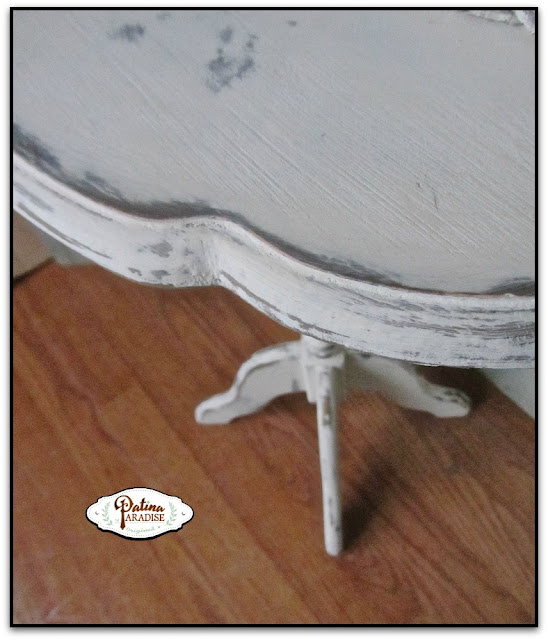 You can see the distressing the best on the base and legs... I used a 5 in 1scraper tool, a sanding block and a sponge with scrubber to get through the layers. When distressing keep the shapes organic rather than lines at an angle and try to think where the piece would have distressed naturally. Look at pictures of real antiques for reference.